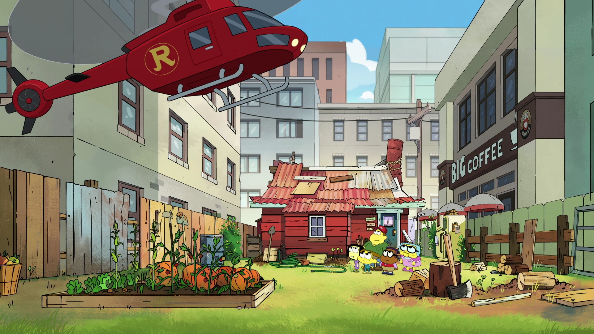 It suddenly begins raining and thundering hard with both families pitted against each other (and Tilly as the referee) as they choose to play touch football, though it soon begins to play like actual football. The families brutalize one another to the point that Cricket and Remy begin arguing. As both sides become more and more determined to win, Cricket and Remy stop and instead hug it out. The weather clears up and the boys tell their families how they have been trying to impress each other, but instead just made things worse. Bill admits that he was intimidated by the Remingtons while the Remingtons admit that they were jealous of the Greens. They resolve their dispute and the Remingtons leave; accidentally knocking over their chimney on the way. Alice takes the football and "scores" to her delight.