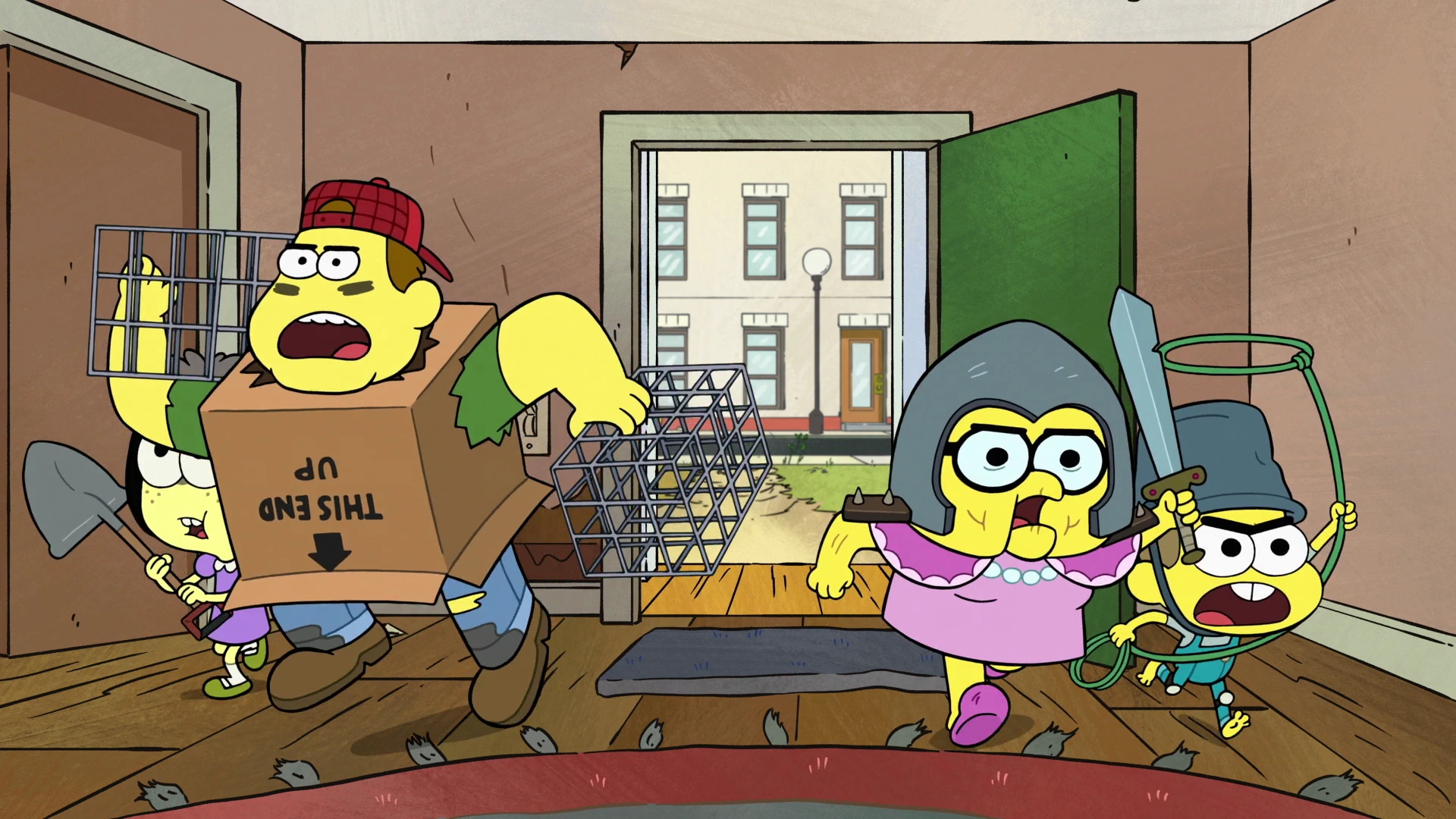 During the chaos, a large raccoon gets caught simultaneously by both Cricket and Bill, leading to a heated argument between them. The raccoon's loud screech alerts other raccoons throughout Big City, and they storm the house, forcing the Green family out. Cricket and Bill argue again, but Alice intervenes, pointing out that their fighting has only made things worse.